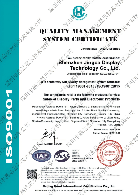 З больш чым дзесяцігоддзем вопыту ў піянерскіх тэхналогіях дысплея, JDA Technologies замацавала сваё становішча ў якасці інавацыйнага лідэра ў вытворчасці перадавых перадачаднатоннаяВК, TFT і OLED дысплеі. Наша прадукцыя пашырае прамысловасць у 100 краінах, якія абслугоўваюць кліентаў у галіне спажывецкай электронікі, аўтамабільнай, медыцынскай дапамогі, прамысловай аўтаматызацыі і за яго межамі. Наша непахісная прыхільнасць да інавацый, якасці і арыентацыі на кліентаў пацвярджаецца нашай сертыфікацыяй ISO9001 і ROSH, што сведчыць пра нашу сістэму высокай якасці і аператыўнае майстэрства.
